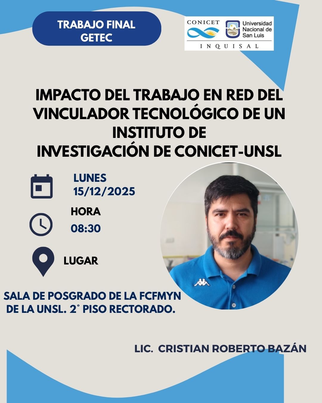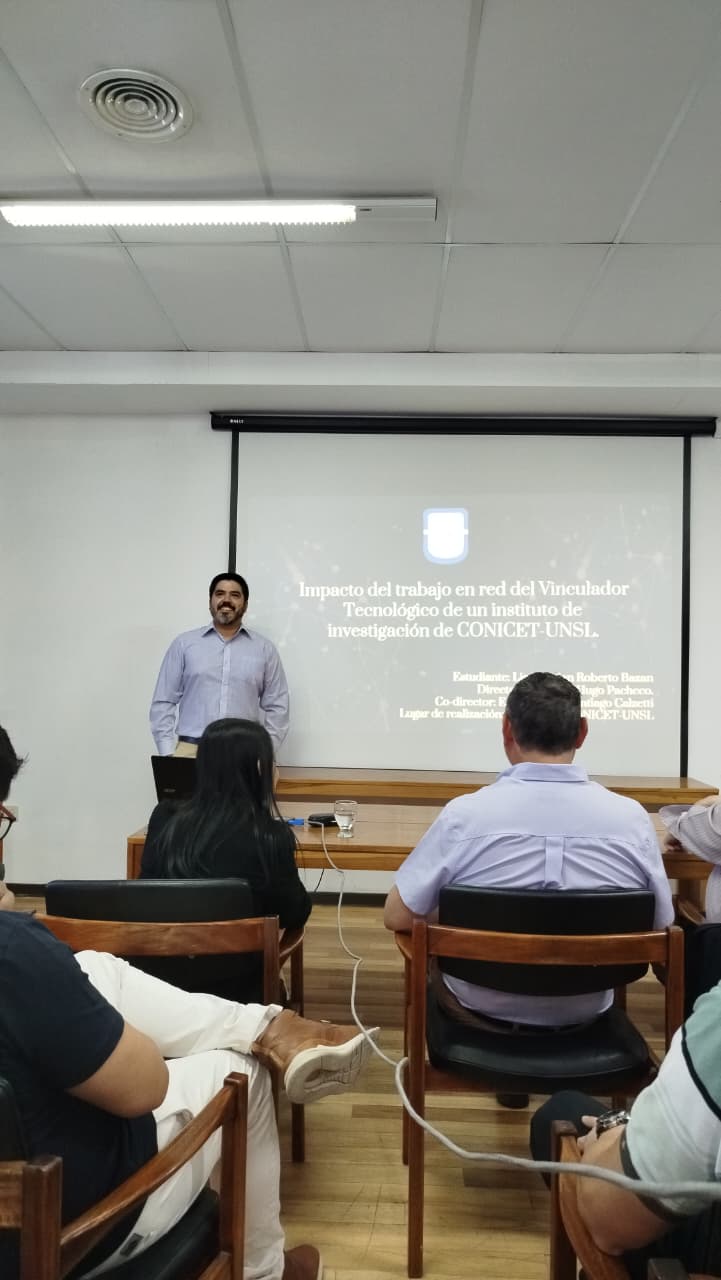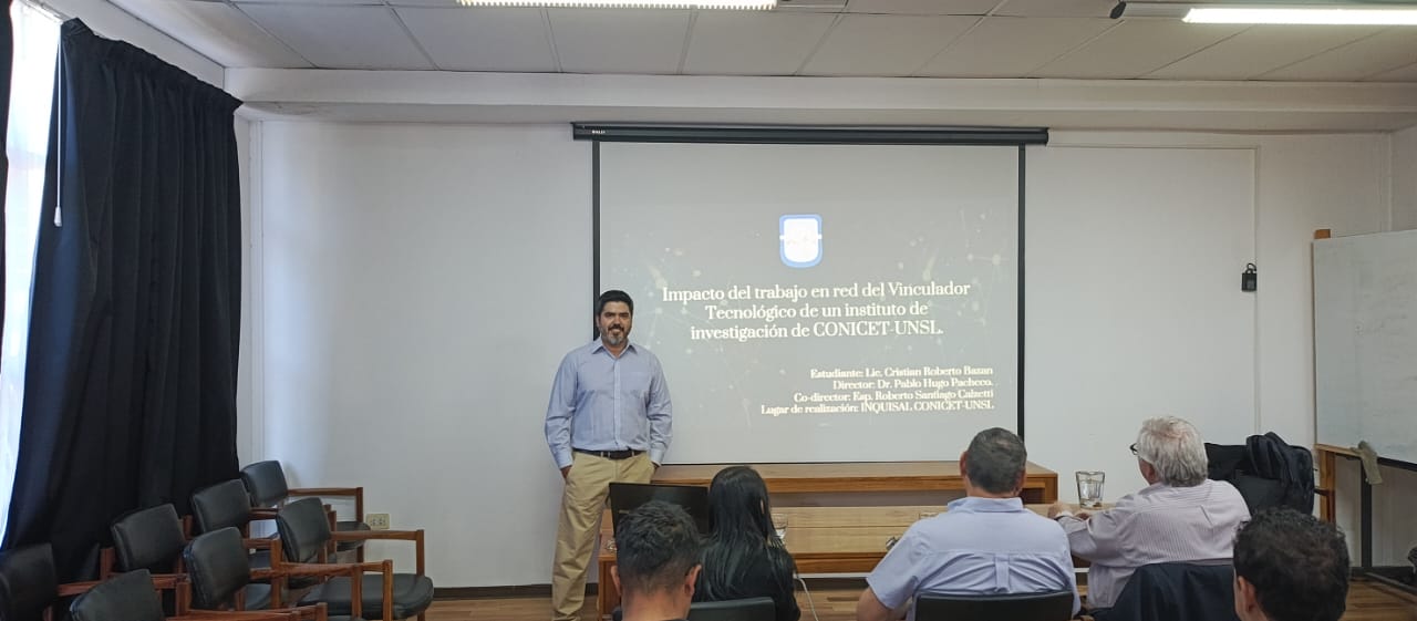 Licenciado Critian Roberto Bazán, hace defensa de su trabajo final del GTec (Especializacion Gestión y Vinculación Tecnológica) de la UNSL.